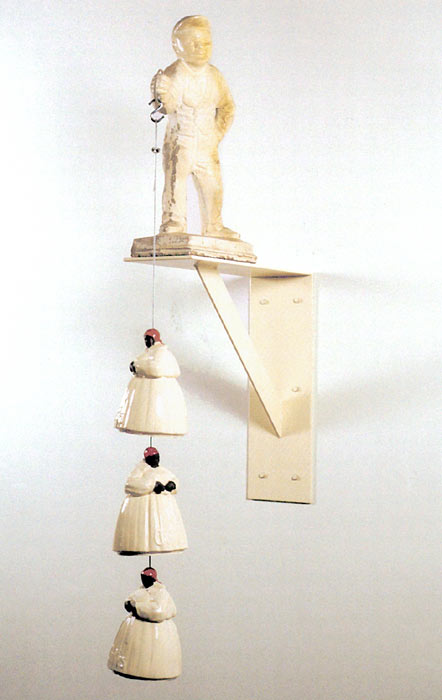 The quote from Zito aptly describes an important aspect of his evolution from a maker of relatively formal explorations of process and material to one who applied that exploration to increasingly self-referential content. This transition became apparent during his solo exhibition in 1997 at our second gallery location at 560 Broadway in which we first showed the strangely affecting sculpture titled Mammy. Three painted bronze casts of a once-considered-appropriate cookie jar were suspended from the hand of an also now inappropriate lawn jockey, that yield a lovely bell-tone when struck with a wooden mallet.